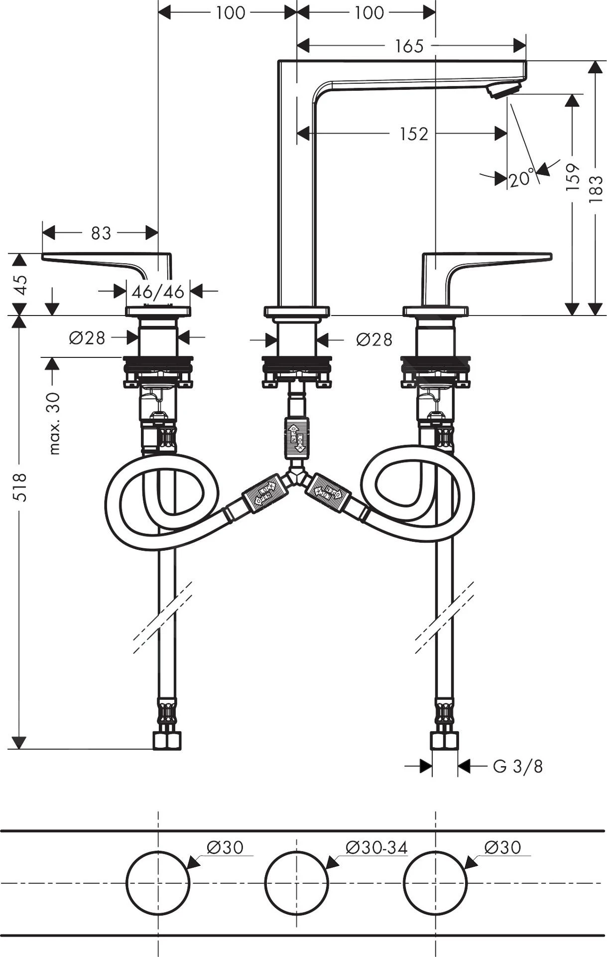 Driegats wastafelmengkraan met afvoergarnituur