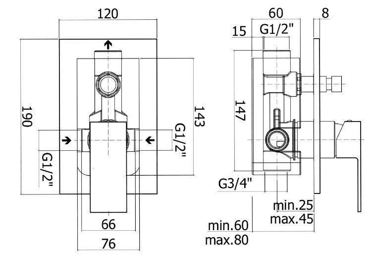 Eengreeps inbouw douchekraan met inbouwdeel en omstelling.