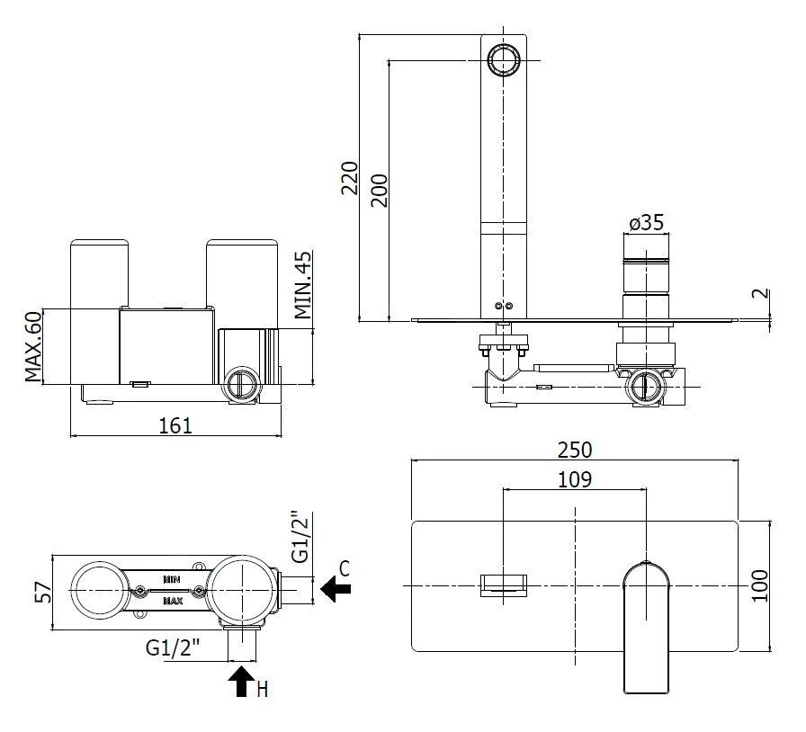 - afmetingen afdekplaat 250 x 100 mm